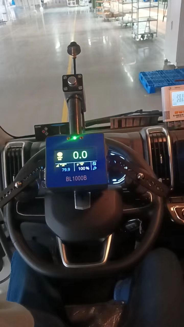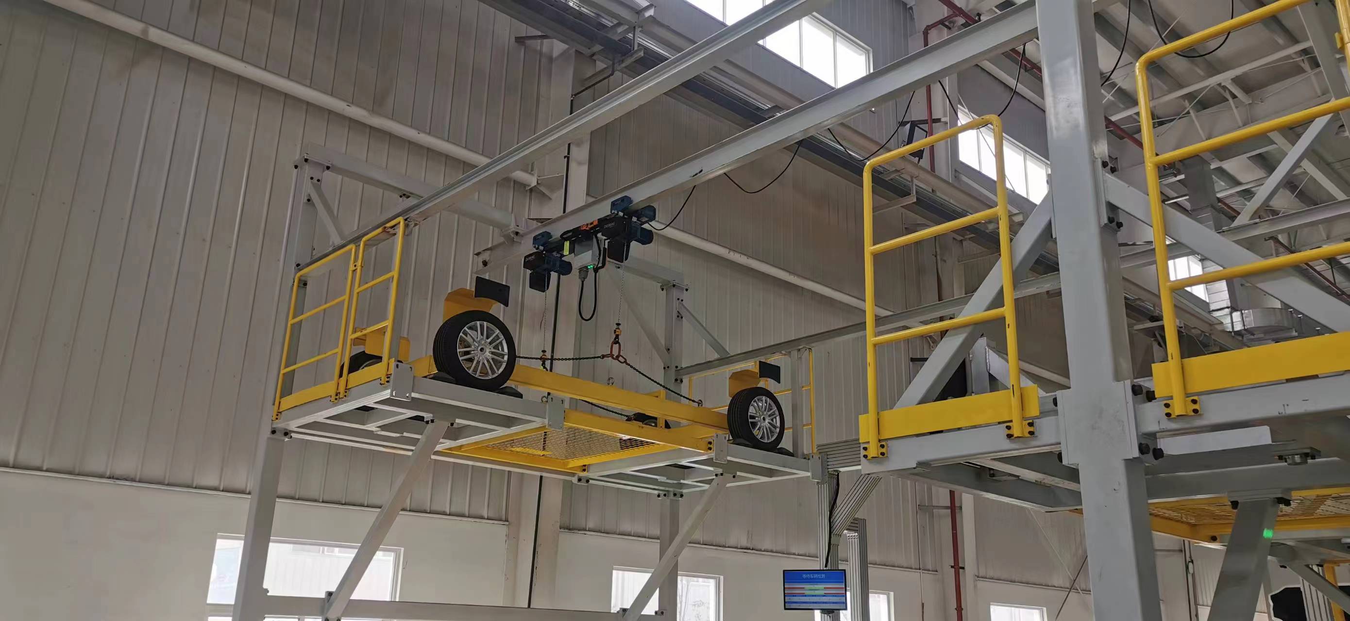 此工位主要检测汽车四轮前束、倾角、主销,定位仪采用德国Visicon 四轮定位传感器判定, 电控采用德国西门子 PLC,工位可满足比亚迪轻卡车型测试标定。